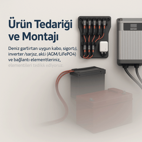 Deniz şartlarına uygun kablo, sigorta/şalter, inverter/şarj cihazı, akü (AGM/LiFePO4) ve bağlantı elemanlarını tedarik ediyoruz. Markadan bağımsız, ihtiyaca en uygun kombinasyonu önerip sertifikalı montaj yapıyoruz. Montaj sonrası parametreleri kalibre ederek sistem verimini maksimize ediyoruz. Tüm ürünler için üretici koşullarına uygun garanti ve destek sağlıyoruz.